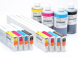Inkoust Mutoh Universal MS je agresivnější, než eko-solventní inkoust, ale oproti předchozím generacím (MS, MS+) klade menší nároky na údržbu stroje a navíc nezapáchá. Cartridge lze vyměnit za chodu stroje.